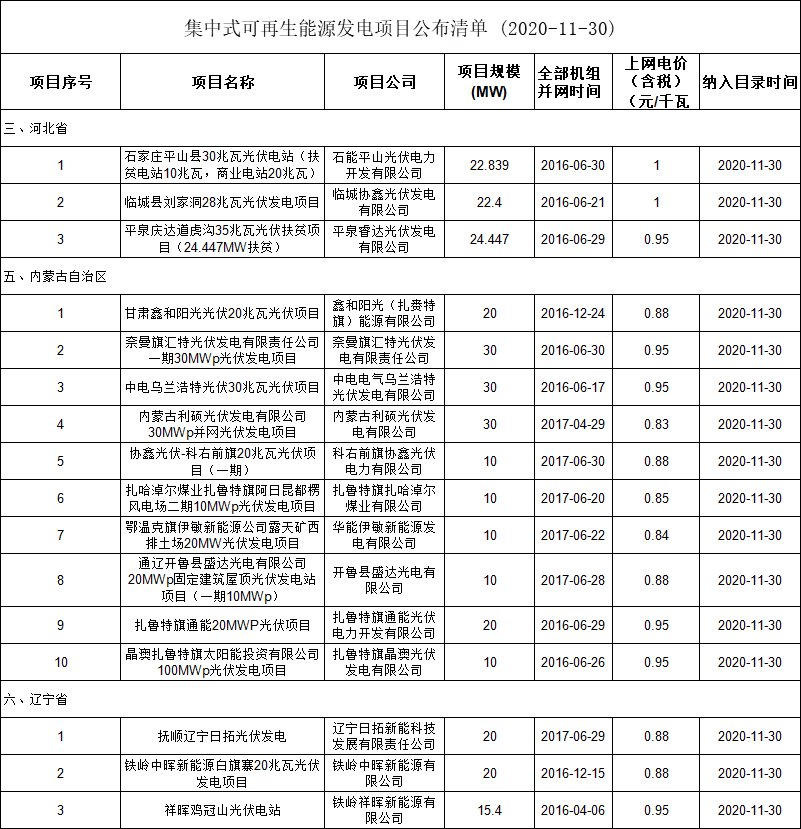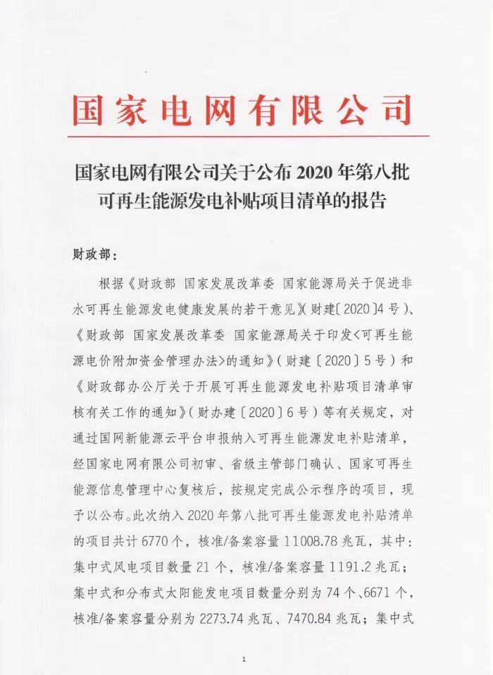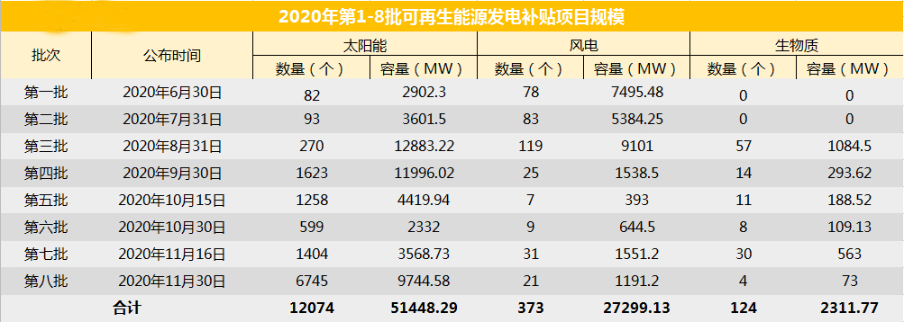 11月30日,國家電網(wǎng)公布2020年第八批可再生能源發(fā)電補(bǔ)貼項(xiàng)目清單,公告顯示此次納入2020年第八批可再生能源發(fā)電補(bǔ)貼清單的項(xiàng)目共計(jì)6770個(gè),核準(zhǔn)/備案容量11008.78MW。