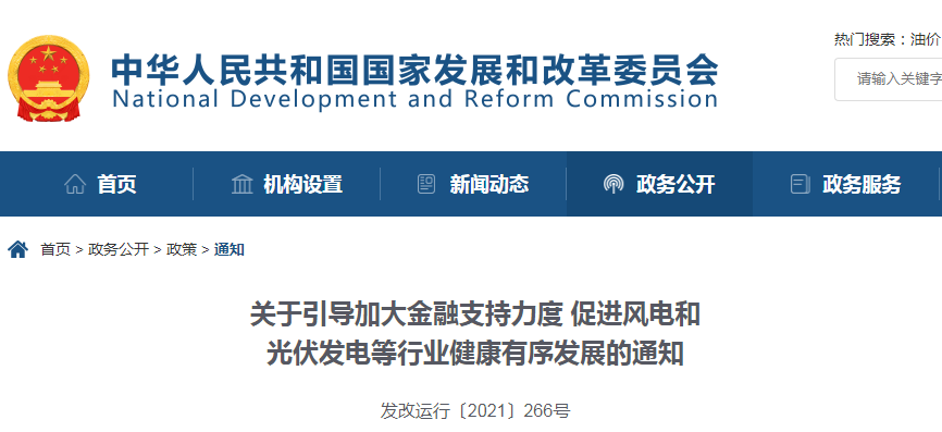 關(guān)于引導(dǎo)加大金融支持力度促進(jìn)風(fēng)電和光伏發(fā)電等行業(yè)健康有序發(fā)展的通知 發(fā)改運(yùn)行〔2021〕266號(hào) 各省、自治區(qū)、直轄市、新疆生產(chǎn)建設(shè)兵團(tuán)發(fā)展改革委、財(cái)政廳(局),人民銀行上??偛?、各分行、營(yíng)業(yè)管理部、各省會(huì)(首府)城市中心支行、副省級(jí)城市中心支行,各銀保監(jiān)局,能源局: