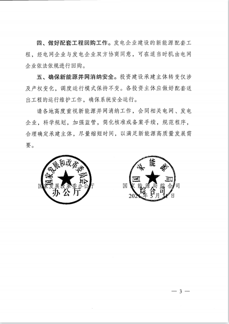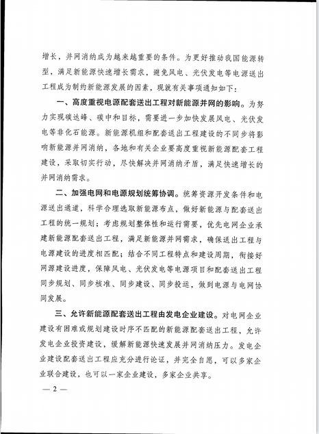 2)優(yōu)先電網(wǎng)企業(yè)承建新能源配套送出工程,保障風(fēng)電、光伏發(fā)電等電源項(xiàng)目和配套送出工程 同步規(guī)劃、同步核準(zhǔn)、同步建設(shè)、同步投運(yùn)。