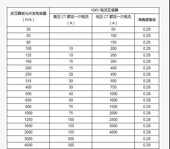 高壓計(jì)量電流互感器的一次額定電流,應(yīng)按總配變?nèi)萘?、光伏發(fā)電接入容量確定。計(jì)量電流互感器配置參考如下表 。
