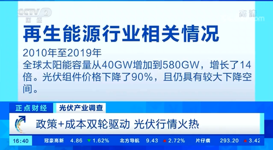 1月20日,CCTV-2財(cái)經(jīng)頻道【正點(diǎn)財(cái)經(jīng)】欄目播出了《光伏產(chǎn)業(yè)調(diào)查報(bào)告》。節(jié)目指出:由于政府政策及成本降低雙輪驅(qū)動(dòng),帶來(lái)近期光伏行情火熱,同時(shí),淡季需求不斷,光伏產(chǎn)品國(guó)內(nèi)外產(chǎn)銷兩旺。