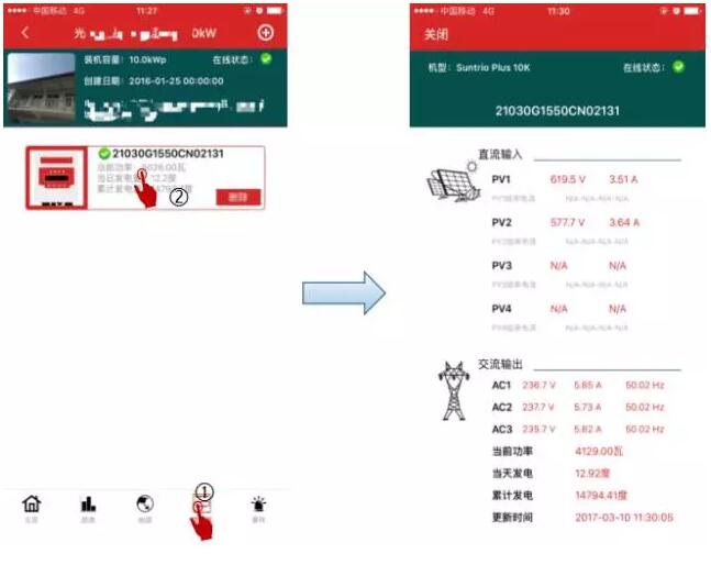 通過APP查看逆變器的運行信息,重點關注逆變器實時的運行信息如直流的電壓、電流參數(shù)。當出現(xiàn)異常,如在排除天氣影響情況下,電壓或者電流很小,逆變器發(fā)電功率很小,及時通知安裝商前來排除故障。